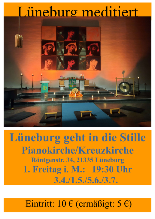 Alle, die in Lüneburg am Abend meditieren möchten, treffen sich immer am ersten Freitag im Monat. Pünktliches Erscheinen (!) vor 19:30 Uhr ist wichtig, damit die Stille durch Zuspätkommende nicht gestört wird. Wir bitten deshalb herzlich um Verständnis, dass die Tür nach 19:30 Uhr nicht mehr geöffnet wird.