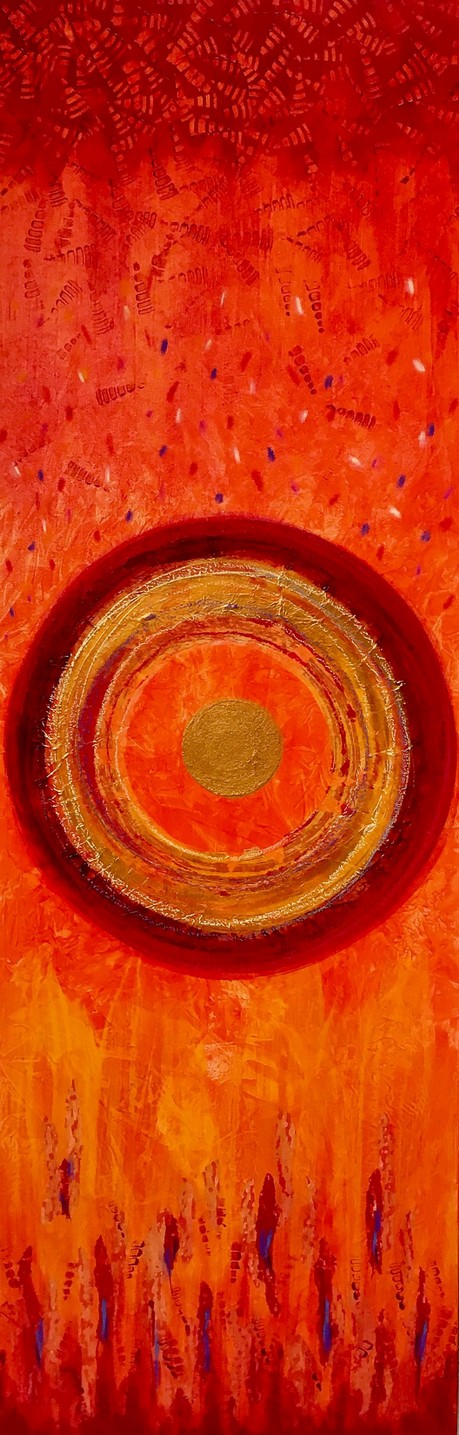 Das Bild hat eine Mitte, den goldenen Kreis. Er ist das Symbol des ewig Vollkommenen ohne Anfang und Ende, Symbol des Göttlichen. Das Göttliche kann im Innersten unsere Mitte sein: die Mitte unserer Seele, als Inspiration unseres Geistes, als Liebe unseres Herzens.