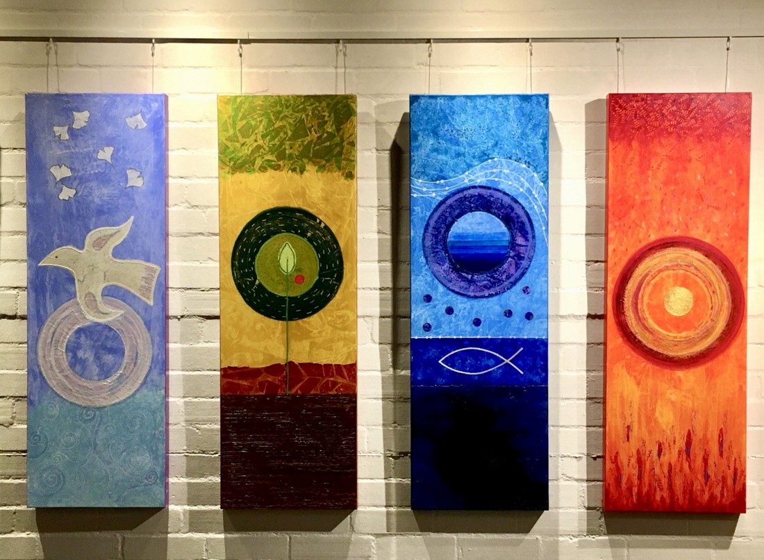 diese Ausstellung von Katja Hirschbiel hat mich sofort tief erreicht. Ich glaube, es sind die intensiv leuchtenden Farben und die Lebenssymbole, die mich persönlich gleich abholen. Zudem interpretieren die Bilder das moderne Glaubensbekenntnis, welches durch das Jahr hindurch immer wieder bei besonderen Gottesdiensten von uns hier in der Kreuzkirche gesprochen wird. Näher an mir und meinem Glauben dran kann also eine Ausstellung nicht sein.- Vielleicht empfinden Sie es ähnlich.